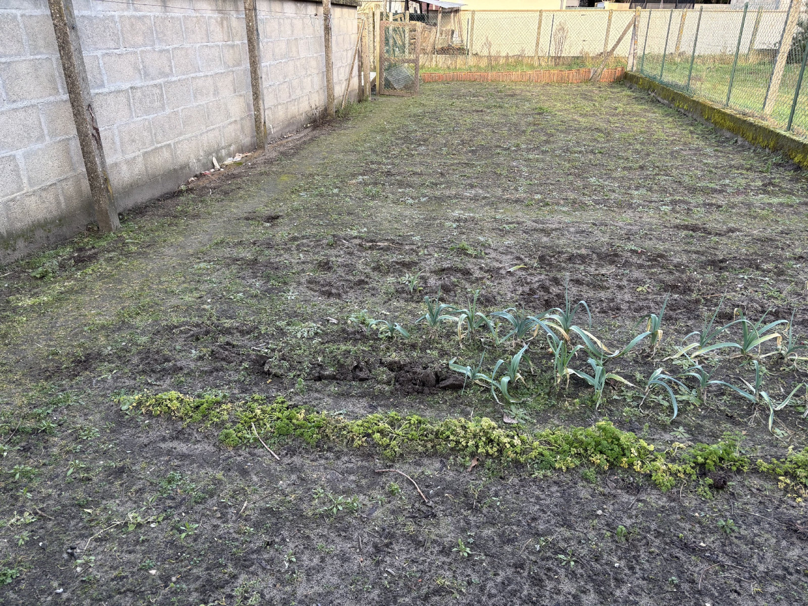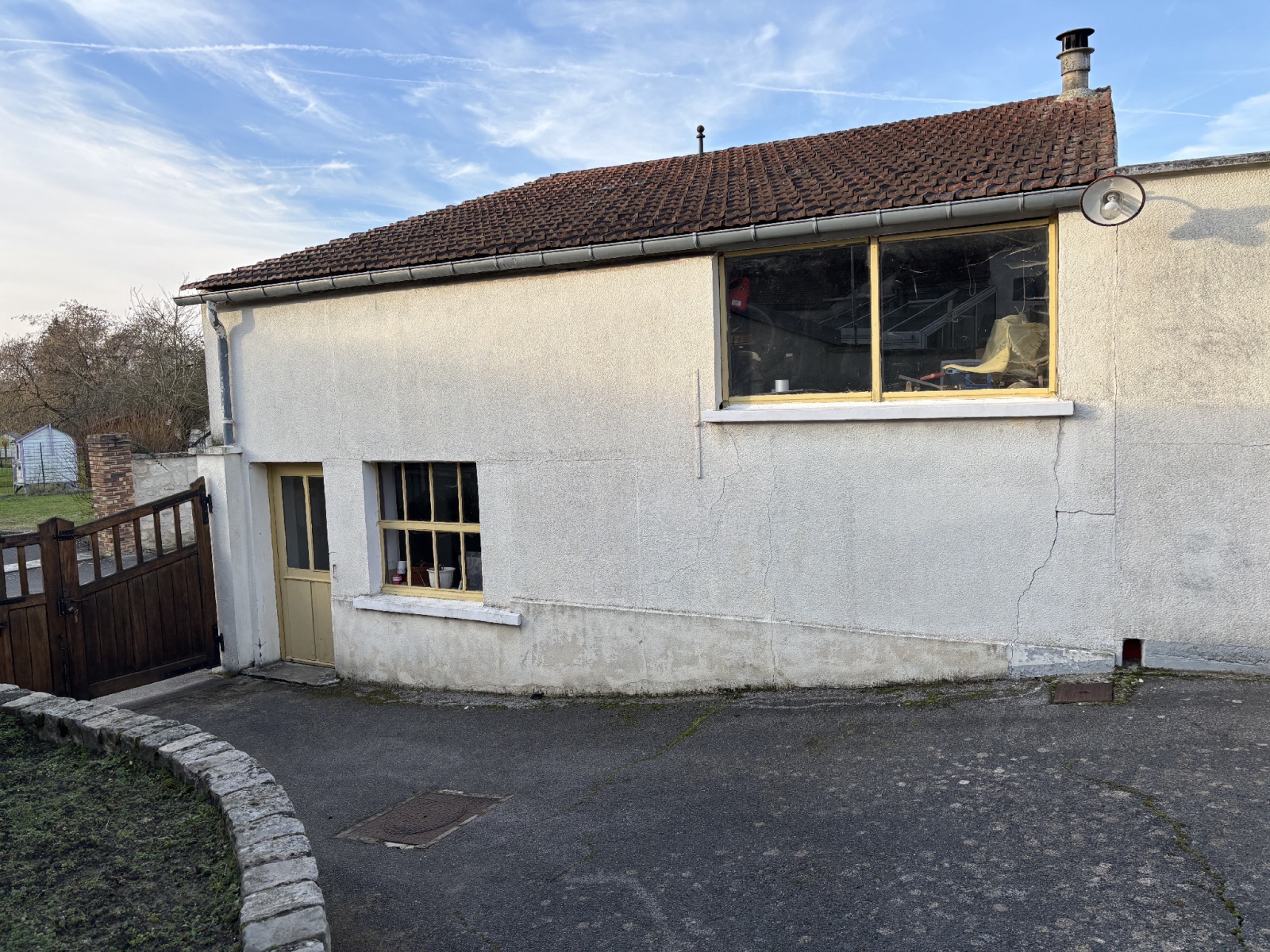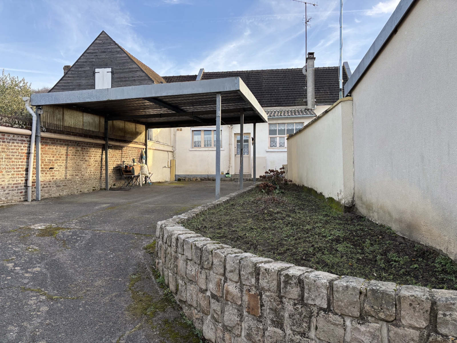 grande cour (3-4 voitures) avec car port, dépendance avec garage et atelier, jardin. 485 m² de terrain au total.